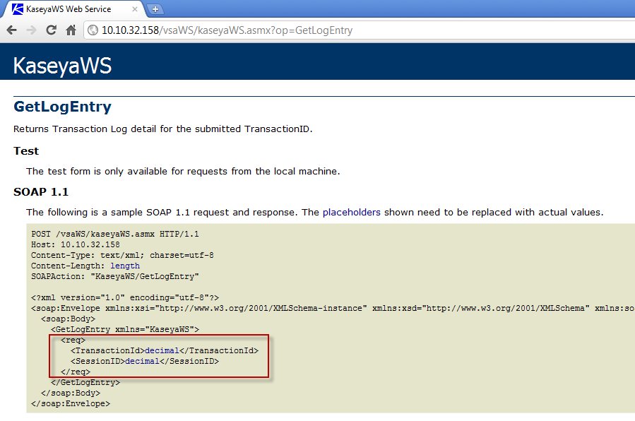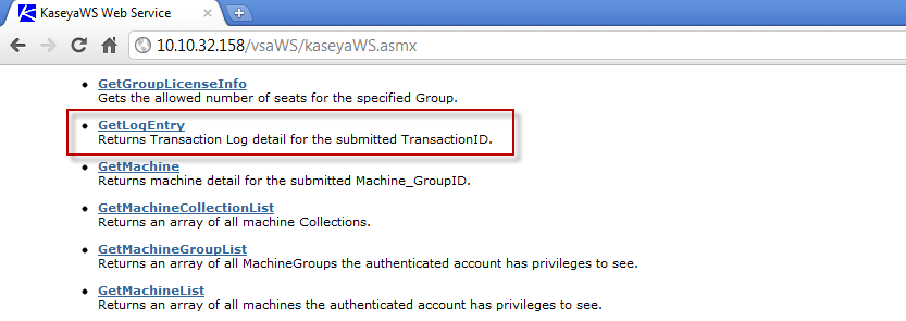 A test client ASP page is also distributed with the VSA API Web Service to help you familiarize yourself with the various API operations. You can use it to see how the ASP client was constructed and incorporate any part of its code into your own application. Users can browse to the actual /vsaWS/KaseyaWS.asmx page of any Kaseya Server, select a web method and copy and paste the exact XML SOAP request structure specified in the WSDL.